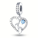 One side of the heart is engraved with the promise "I LOVE U FOREVER," while the other sparkles with clear cubic zirconia and a prominent round blue crystal, celebrating the arrival of a son. The bail is detailed with a row of embossed hearts. It is the perfect keepsake for a new mom, a baby shower gift, or a way to cherish your little prince.