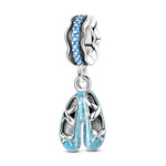Delicate silver ribbons crisscross over the slippers, ending in tiny bows at the toes. The bail is uniquely designed with a wavy edge and paved with bright blue cubic zirconia stones, adding a rhythm of color. Whether for a dance recital, a teacher appreciation gift, or a lover of the "Balletcore" aesthetic, this charm is a graceful addition to any collection.