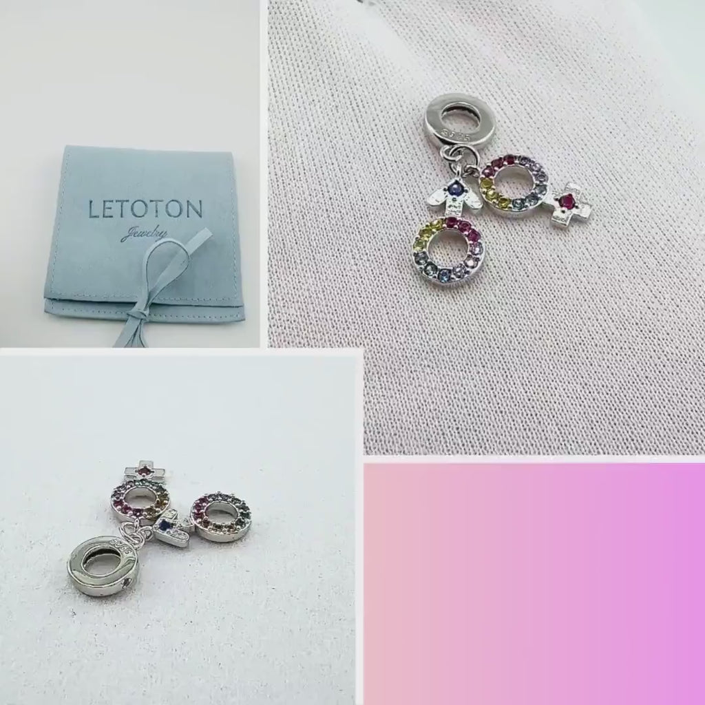 Both icons are paved with a cheerful rainbow array of yellow, pink, purple, and blue cubic zirconia stones, symbolizing the colorful nature of relationships. The bail is accented with a tiny pink heart. Whether representing a couple, celebrating gender balance, or simply adding a pop of color to your look, this charm is a meaningful token of connection.