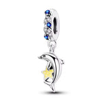 The bail is encrusted with alternating deep blue and clear cubic zirconia stones, mimicking the sparkle of ocean waves and bubbles. This piece is a perfect keepsake for beach lovers, a memento of a tropical vacation, or a symbol of freedom and intelligence.