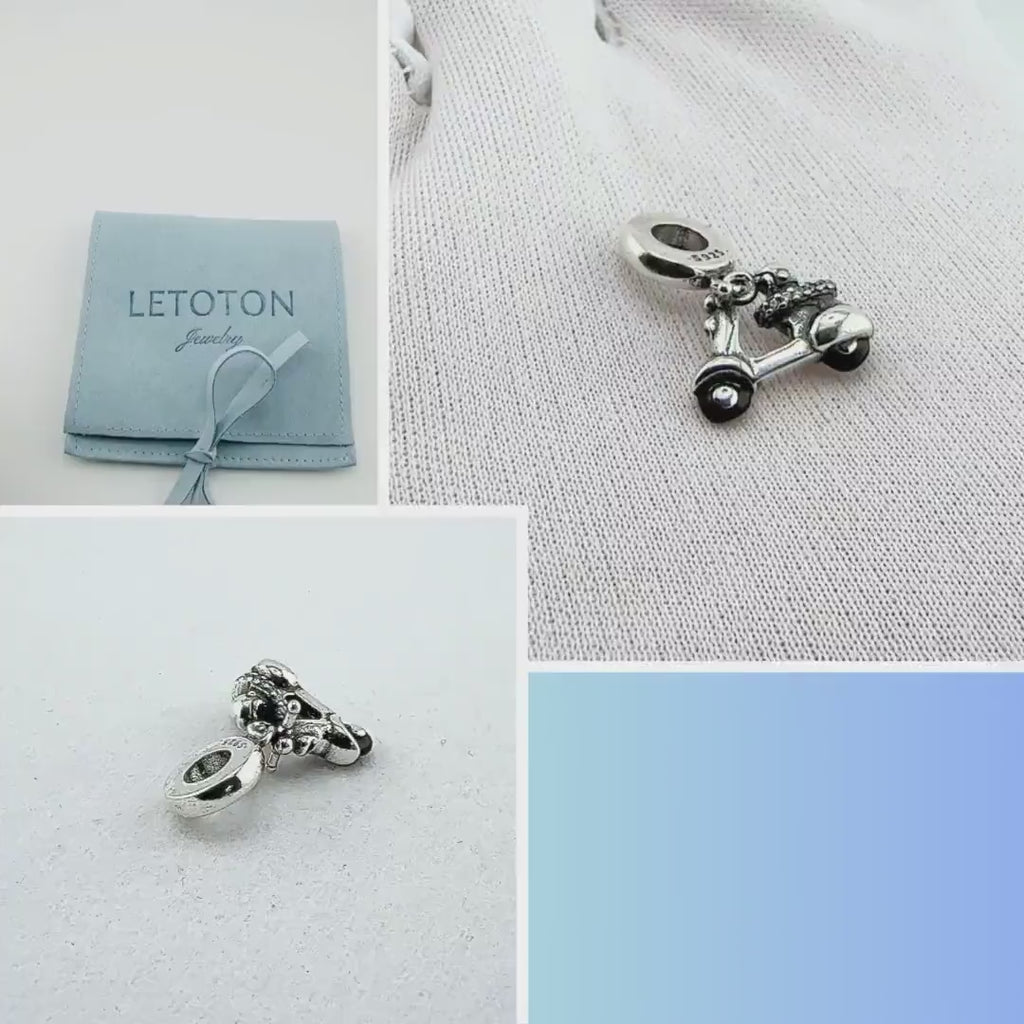 A row of sparkling clear cubic zirconia lines the side, adding a touch of luxury to this vintage ride. Whether you dream of cruising along the Amalfi Coast, love the freedom of two wheels, or simply adore retro style, this charm is a chic and adventurous addition to your collection.